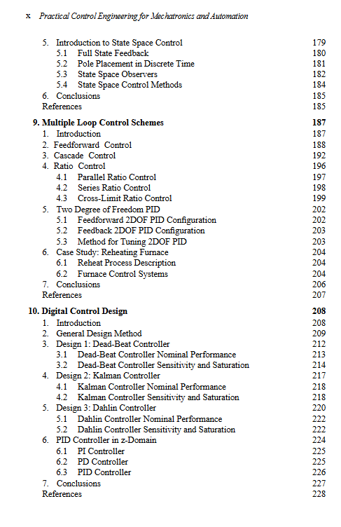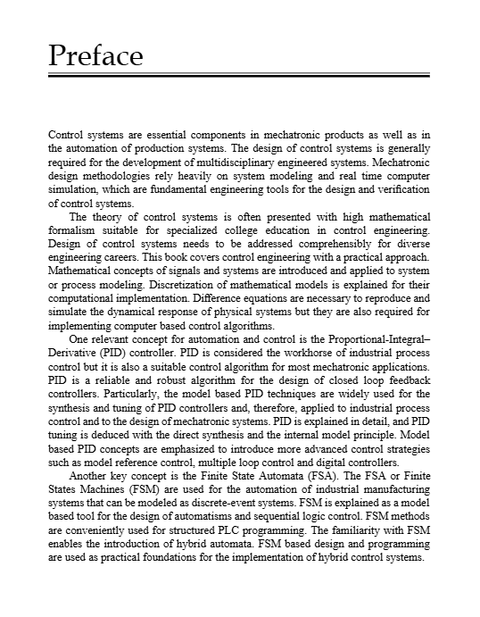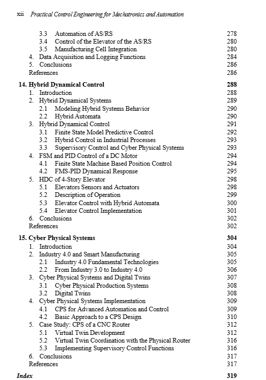 Production processes and engineered systems use continuous and discrete variables, as well as the combination of continuous and sequential operations. This volume covers both aspects, thus providing knowledge in continuous and discrete control, logic control, and hybrid control systems. It is a compilation of selected control strategies to automate processes and systems with a practical approach to ease their design, analysis and implementation. The selection of the control schemes is based on the capability to provide desired dynamical response or real time performance. Practicality is required for achieving faster development times of automation projects or system prototypes by comprehensive presentation and direct application of methodologies and techniques for efficient and structured programming of control algorithms. Considered methodologies include model-based design, hardware in the loop simulations and structured programming. Fundamental signals and systems concepts are explained. Systems and controllers are analyzed using discrete-time equations, which ease their implementation in most programmable platforms without requiring sophisticated software. PID based control, internal model control and model reference control are viewed as powerful schemes in terms of performance and suitability for mechatronics systems because of the use of the model in their architecture as a key control element. Finite state machines are presented to solve sequential requirements of direct and supervisory control of many processes and machines. Cyberphysical systems are an industrial technology and an education trend, distinguished by visual and dynamic models or digital twins of the physical systems. The discussed analysis, design and implementation practices are integrated and applied in the context of cyberphysical systems. This book aims to provide multidisciplinary support to engineers and practitioners in the design of control systems, and is a valuable tool for automation teaching and self-learning.